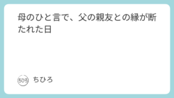 ぶろぐ 母のひと言で、父の親友との縁が断たれた日 ちひろ父の親友は母のせいで断たれるそのご家族とは長年、温かいお付き合いをしていました。信じられないほど恩知らずで、身勝手な母の言動。母のゲスっぷり私の父には無二の親友がいました。実の兄のように慕っていた方でした。この方をS専務と呼ばせていた... 2025.10.14 ぶろぐ